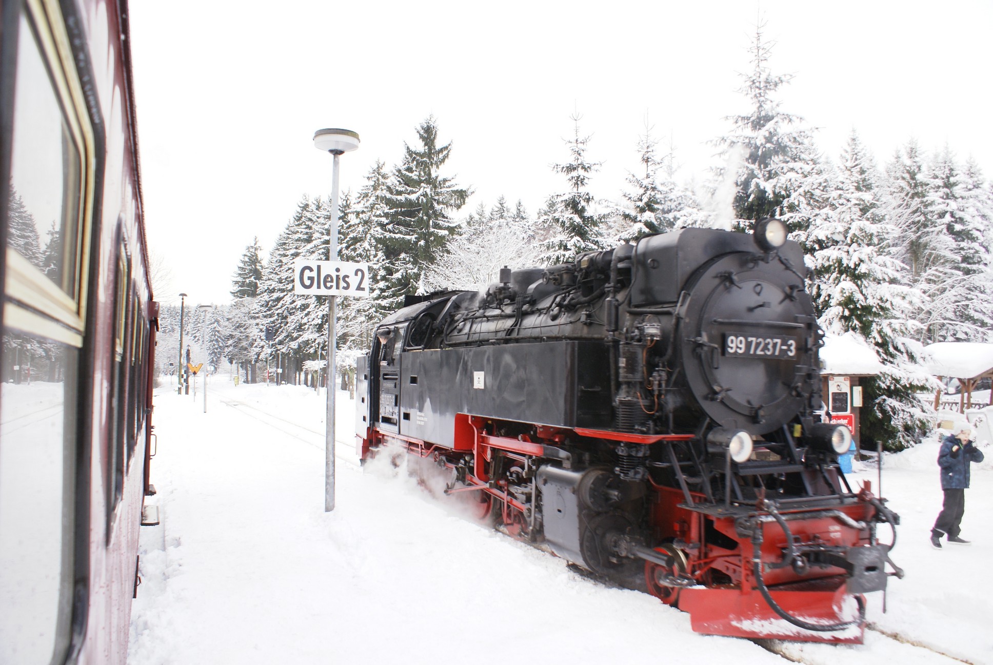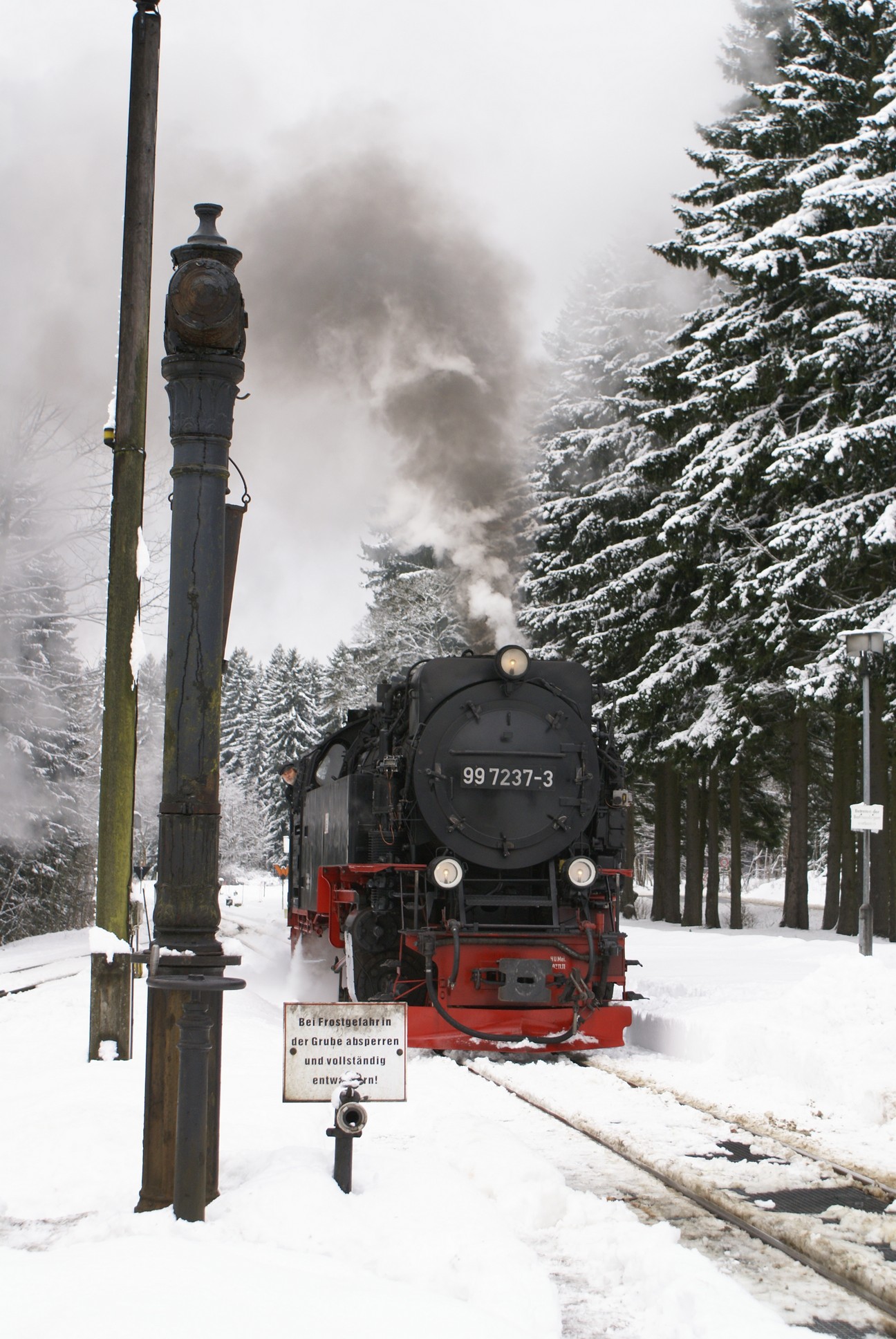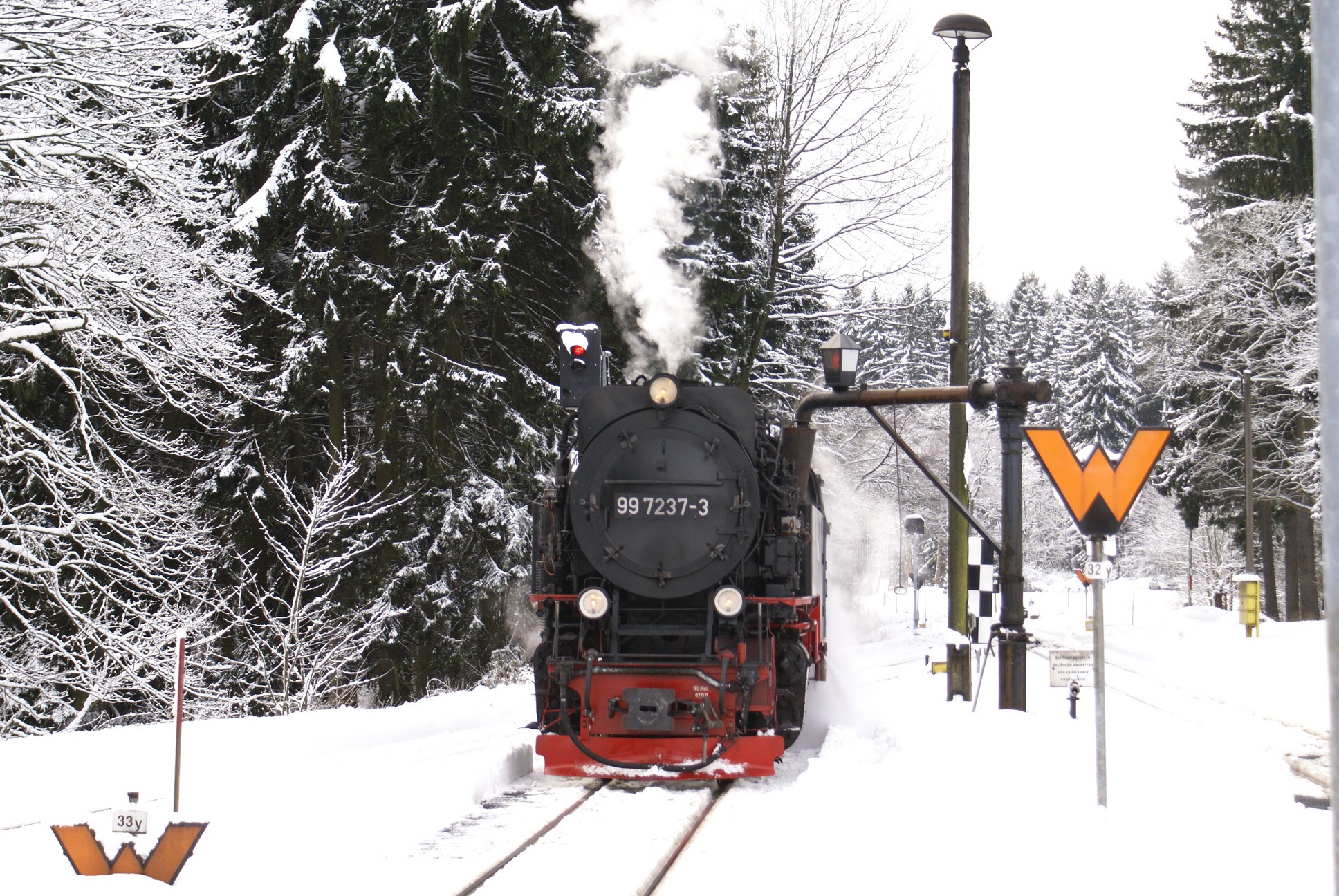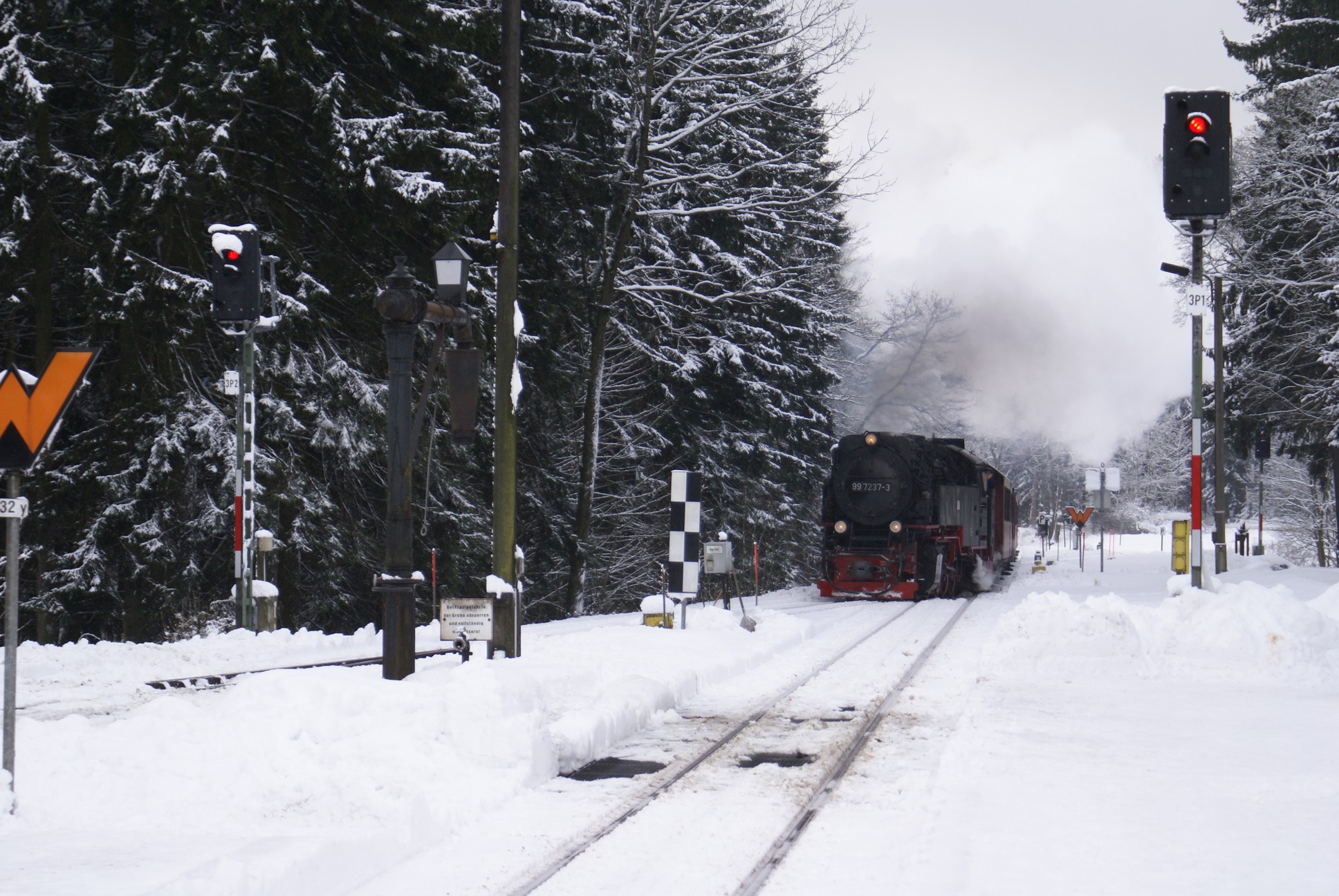 Dringend zu empfehlen ist für Autofahrer die Mitnahme von Schaufel und Besen zur Reinigung eines Parkplatzes! Der Winterdienst ist nämlich micht die besondere Stärke der Stadt Wernigerode!!! Bahnhof Drei Annen Hohne 99 7237 mit dem 8920 aus Nordhausen 99 7247 mit dem 8903 aus Wernigerode 99 7732 mit 8932 vom Brocken |