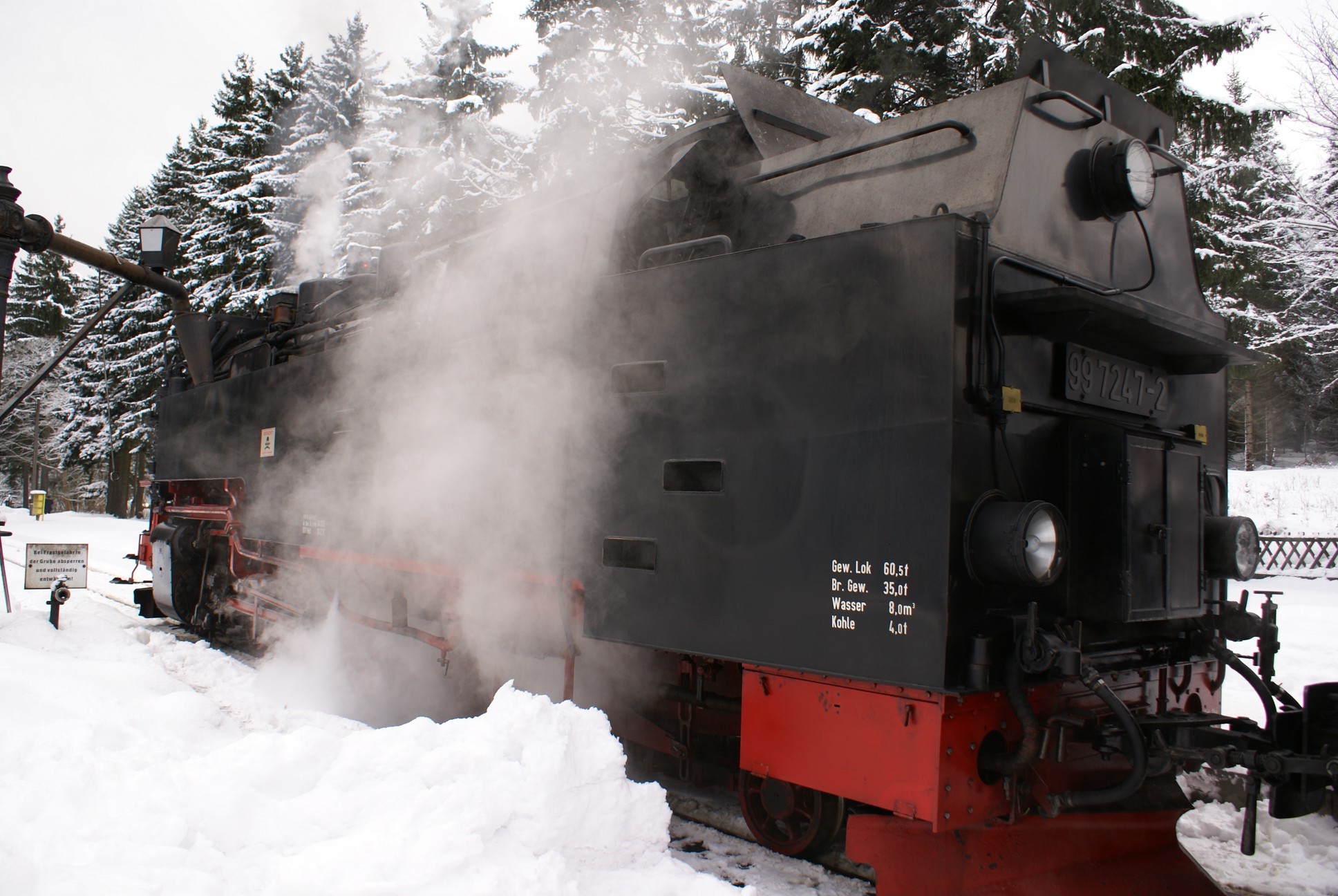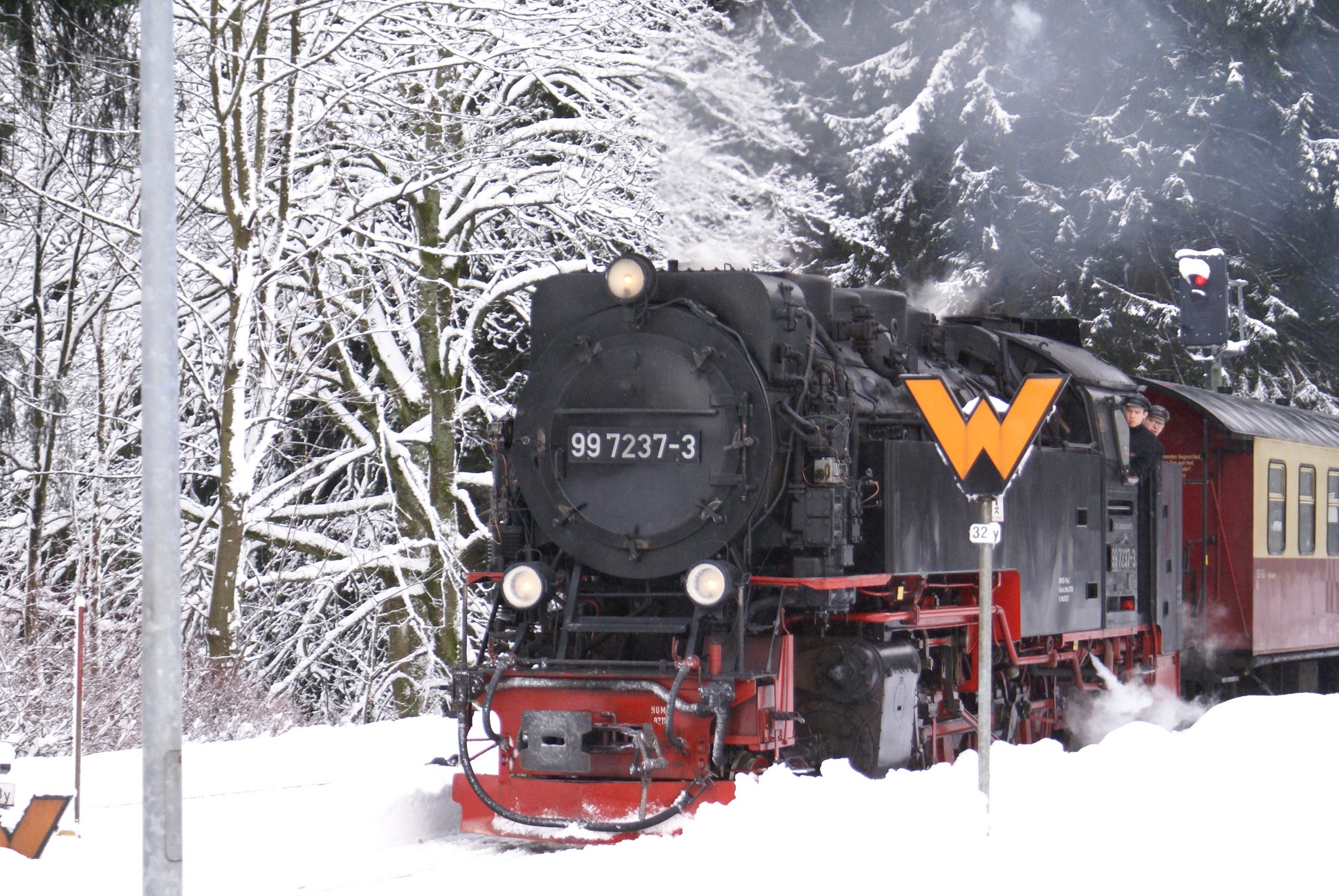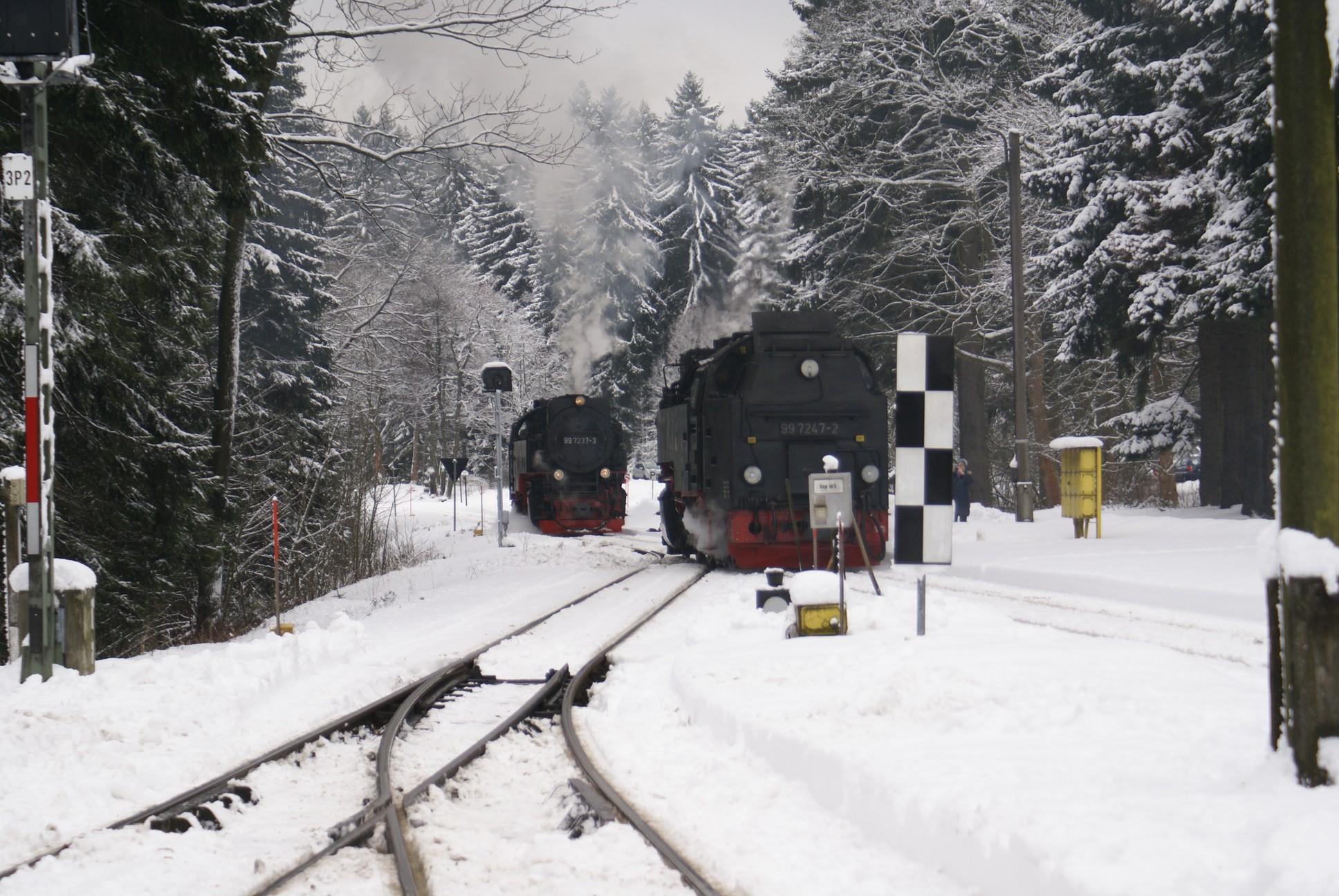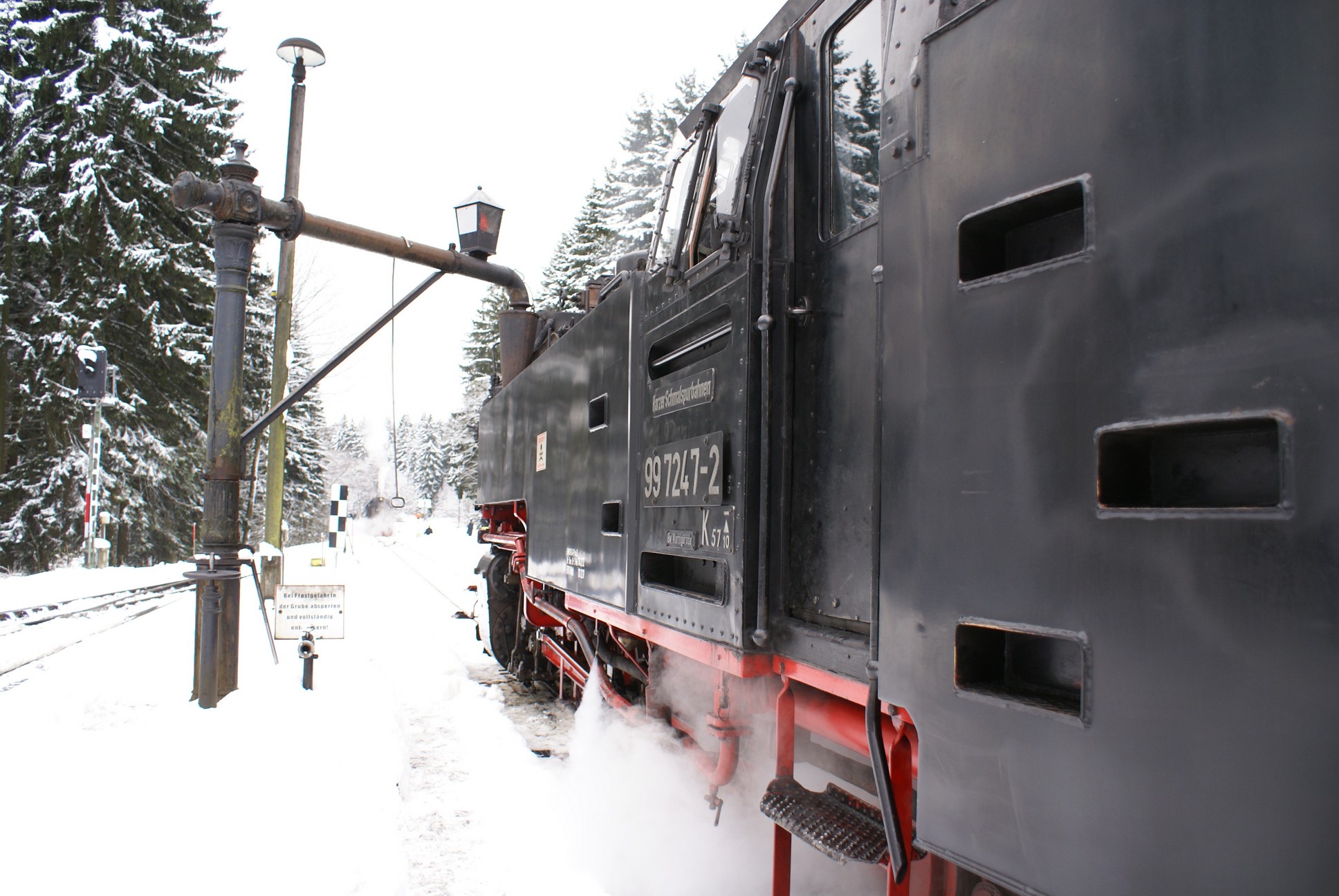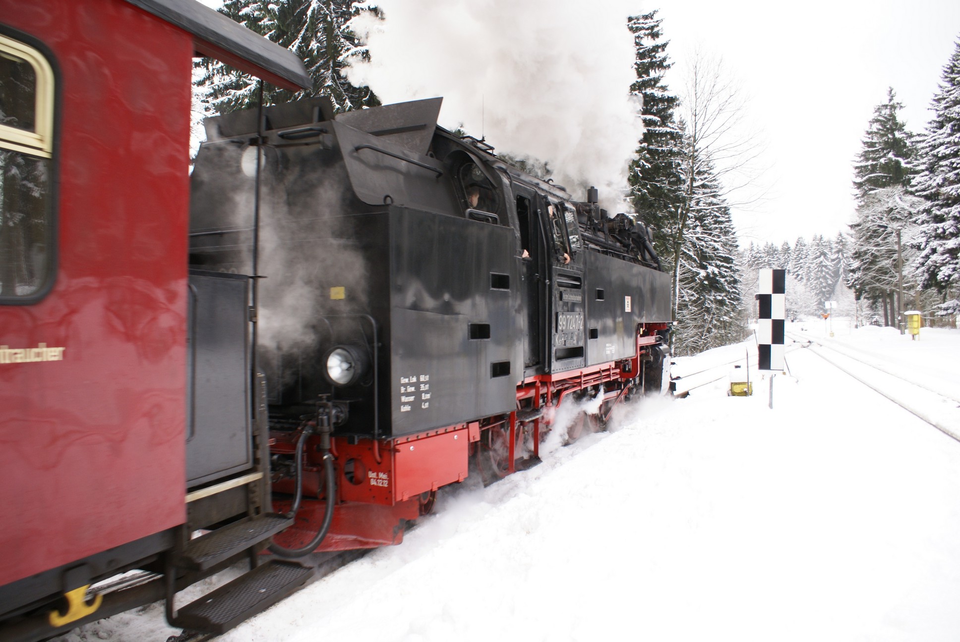 Dringend zu empfehlen ist für Autofahrer die Mitnahme von Schaufel und Besen zur Reinigung eines Parkplatzes! Der Winterdienst ist nämlich micht die besondere Stärke der Stadt Wernigerode!!! Bahnhof Drei Annen Hohne 99 7237 mit dem 8920 aus Nordhausen 99 7247 mit dem 8903 aus Wernigerode 99 7732 mit 8932 vom Brocken |