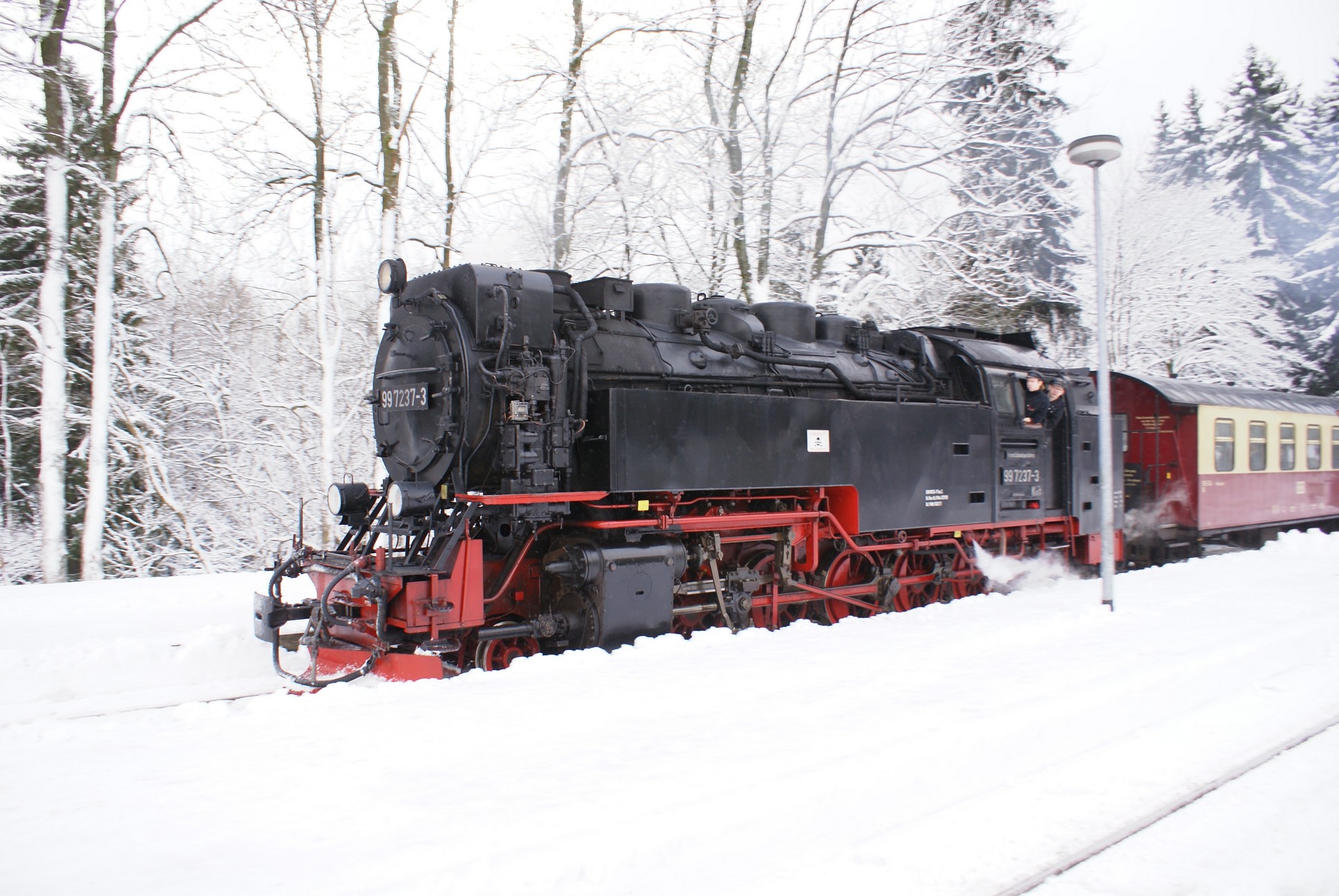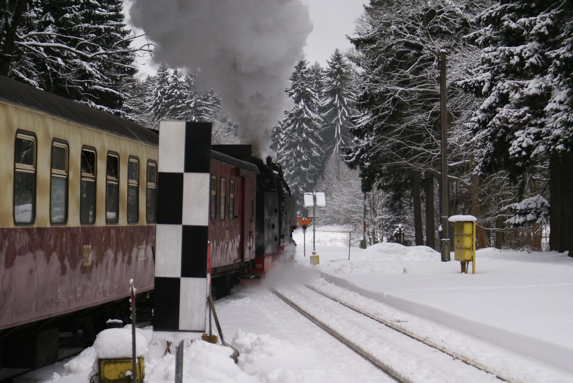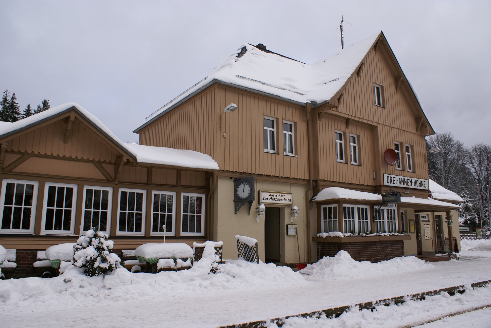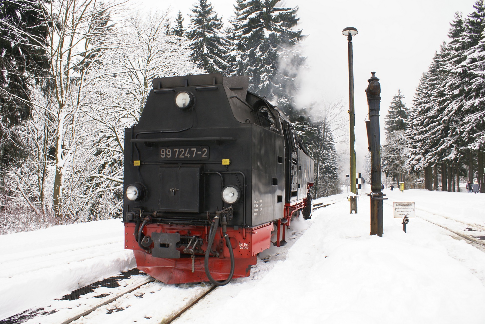 Dringend zu empfehlen ist für Autofahrer die Mitnahme von Schaufel und Besen zur Reinigung eines Parkplatzes! Der Winterdienst ist nämlich micht die besondere Stärke der Stadt Wernigerode!!! Bahnhof Drei Annen Hohne 99 7237 mit dem 8920 aus Nordhausen 99 7247 mit dem 8903 aus Wernigerode 99 7732 mit 8932 vom Brocken |